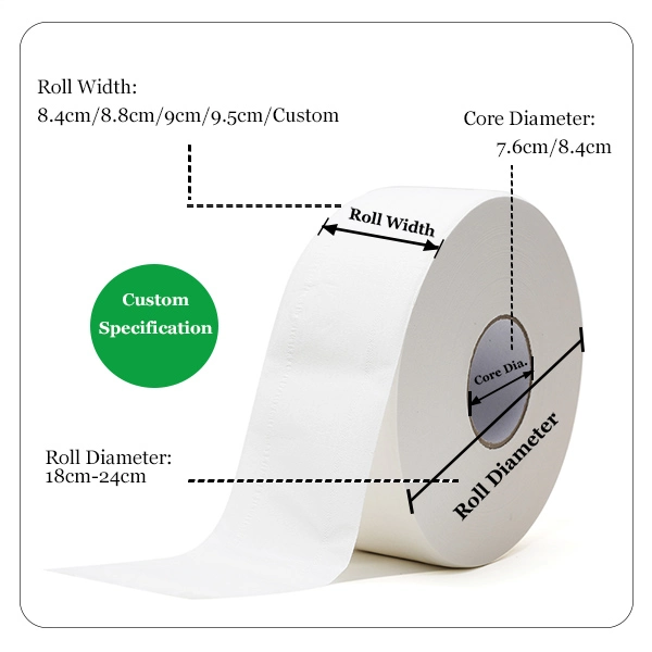 A standard jumbo roll bathroom tissue usually measures around 9 inches in diameter and can be up to 1000 feet long. The core diameter is typically about 3.3 inches.